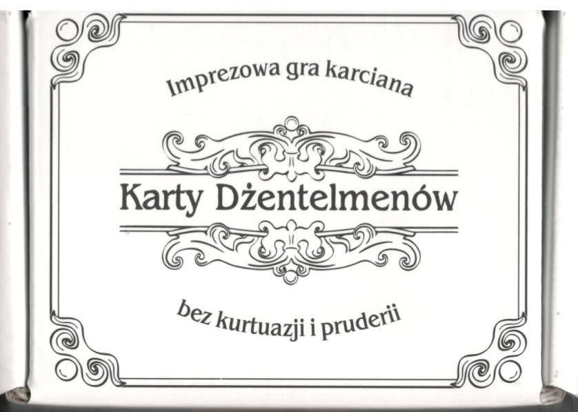 Karty Dżentelmenów : imprezowa gra karciana bez kurtuazji i pruderii / pytania i tłumaczenia (autor): Aleksander Kozik, odpowiedzi i mechanika gry (autor): Marcin Jaros ; grafiki i dekory: artysta plastyk Cezary Marek. - [Opole] : Kojar s.c., [2020]. - 1 gra (220 kart w tym: 53 Czarne Karty pytań, 161 Białych Kart odpowiedzi, 2 puste Czarne Karty na Twoje pytania, 4 puste Białe Karty na Twoje odpowiedzi) : tektura, karton, kolor ; w pudełku 11x8x7 cm + instrukcja (7 stron ; 11 cm).